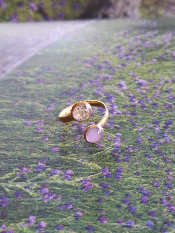 Este anillo doble está elaborado con flores de Zanahoria silvestre y fondo lila