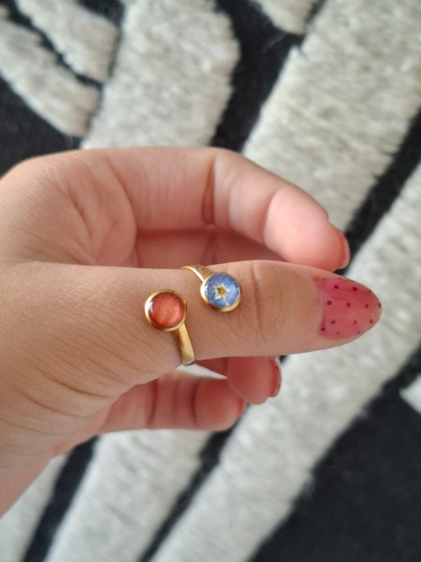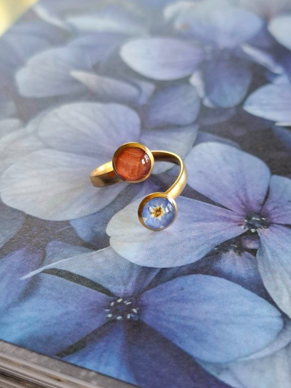 Este anillo doble está elaborado con una No me Olvides y un fragmento de pétalo de Caléndula naranja