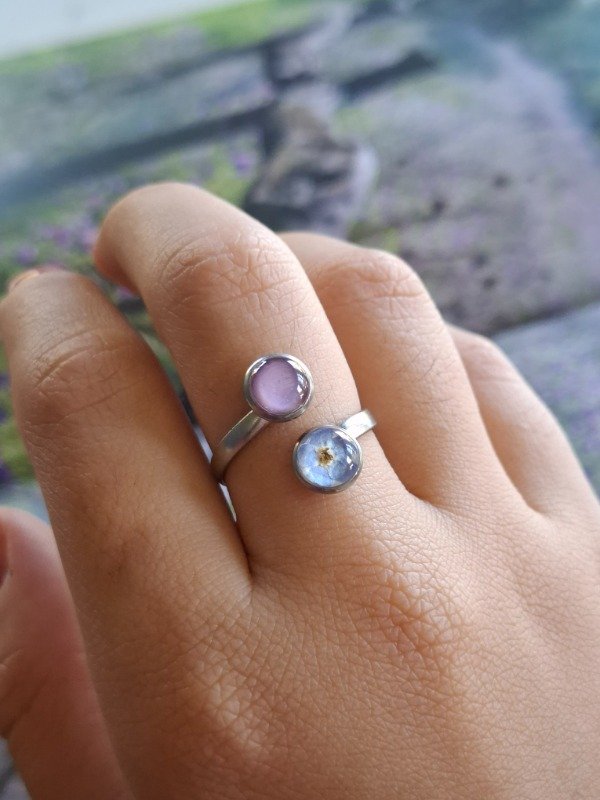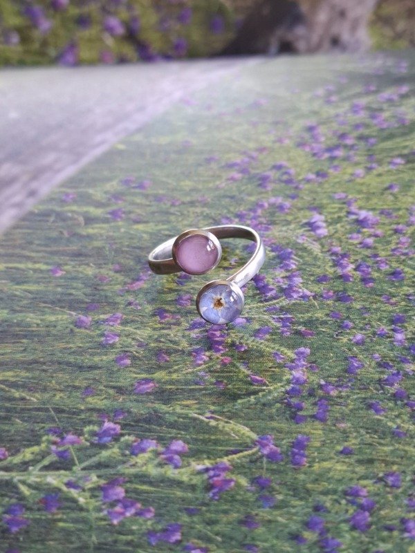 Este anillo doble está elaborado con una No me Olvides y fondo lila