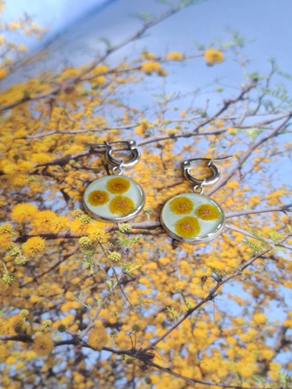 Estos aros con pimpollos de Mimosa o Acacia dealbata en fondo celeste son una auténtica joya realizada en acero quirúrgico, e incluyen una bolsita para que te acompañen a donde vayas, aunque no los lleves puestos :)