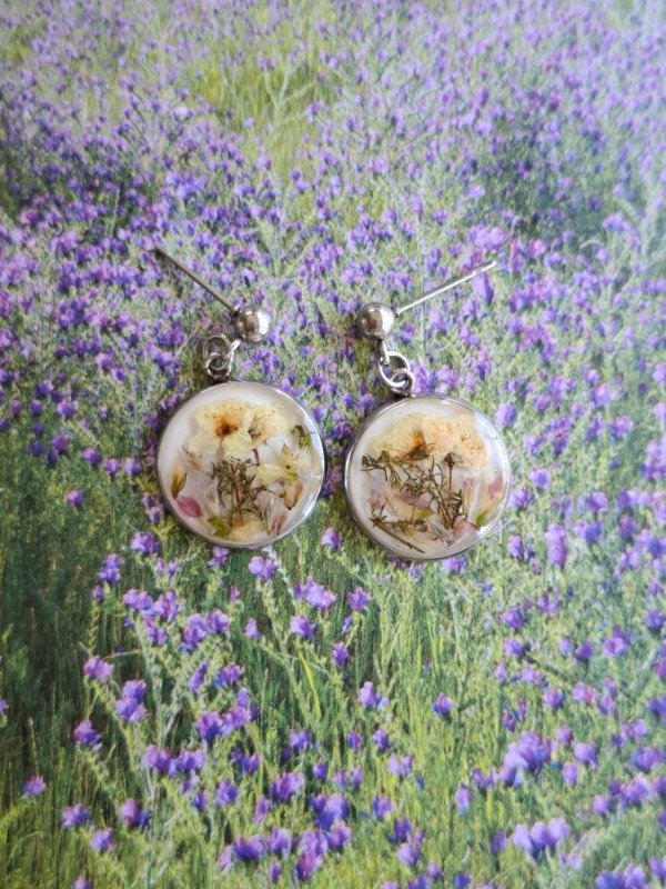 Estos aros con Coronas de Novia, fragmentos de Santa Rita rosa, helechos, flores de Limonium y flores de Melilotus son una auténtica joya realizada en acero quirúrgico, e incluyen una bolsita para que te acompañen a donde vayas, aunque no los lleves puestos :)