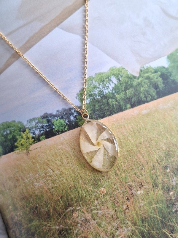 Este dije con un Jazmín es una auténtica joya realizada en latón, e incluye su cadena de acero quirúrgico dorado y una bolsita para que te acompañe a donde vayas, aunque no lo lleves puesto :)