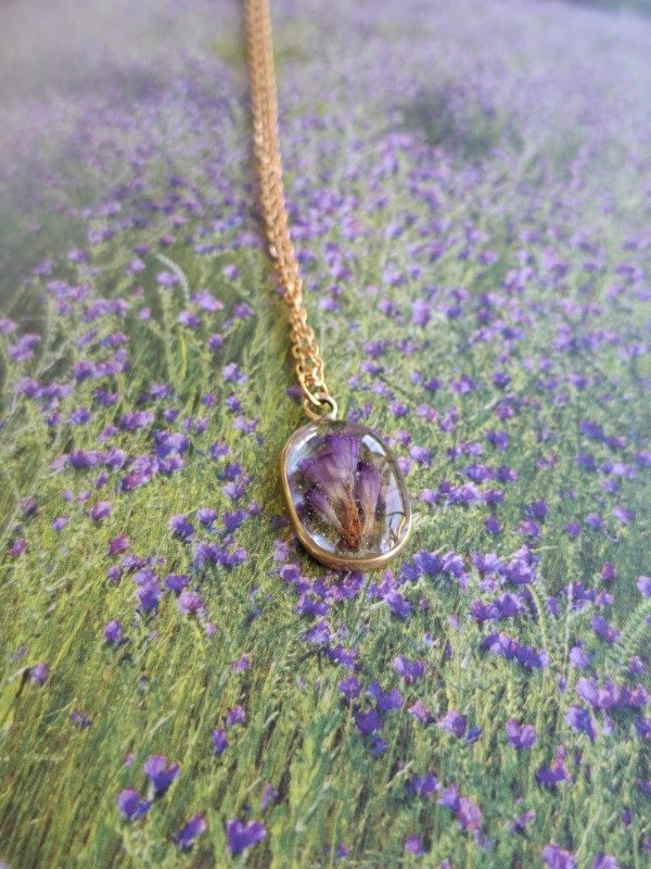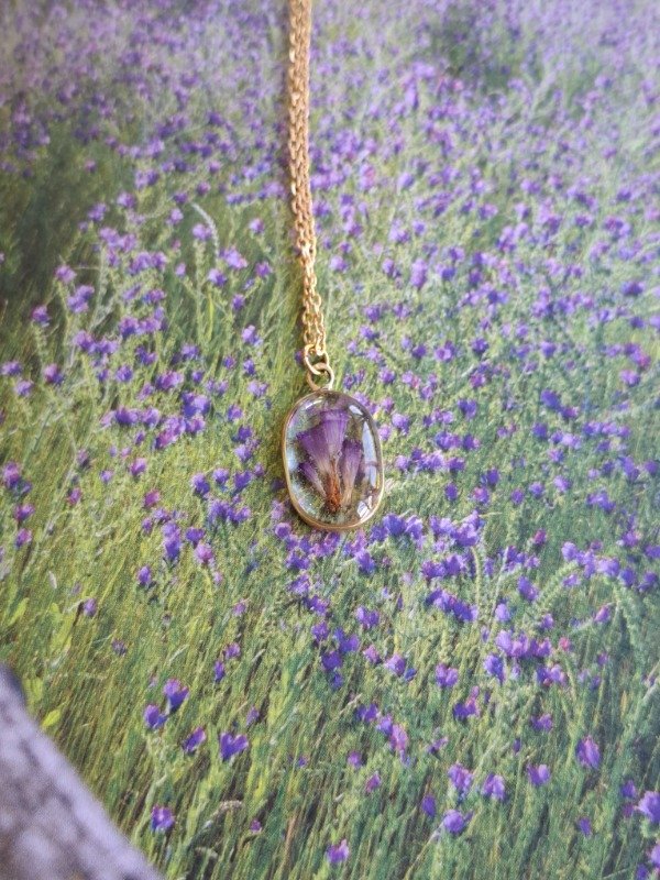 Este dije con pétalos de Siempreviva violeta es una auténtica joya realizada en latón, e incluye su cadena de acero quirúrgico dorado y una bolsita para que te acompañe a donde vayas, aunque no lo lleves puesto :)