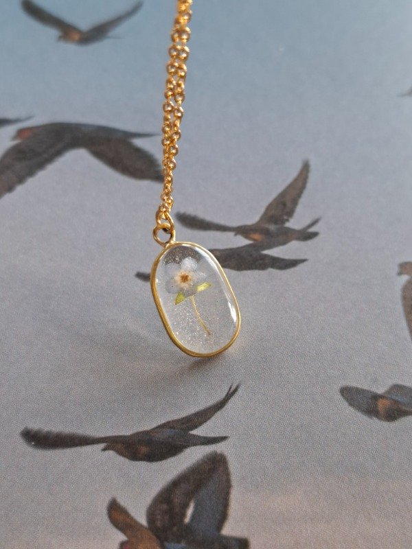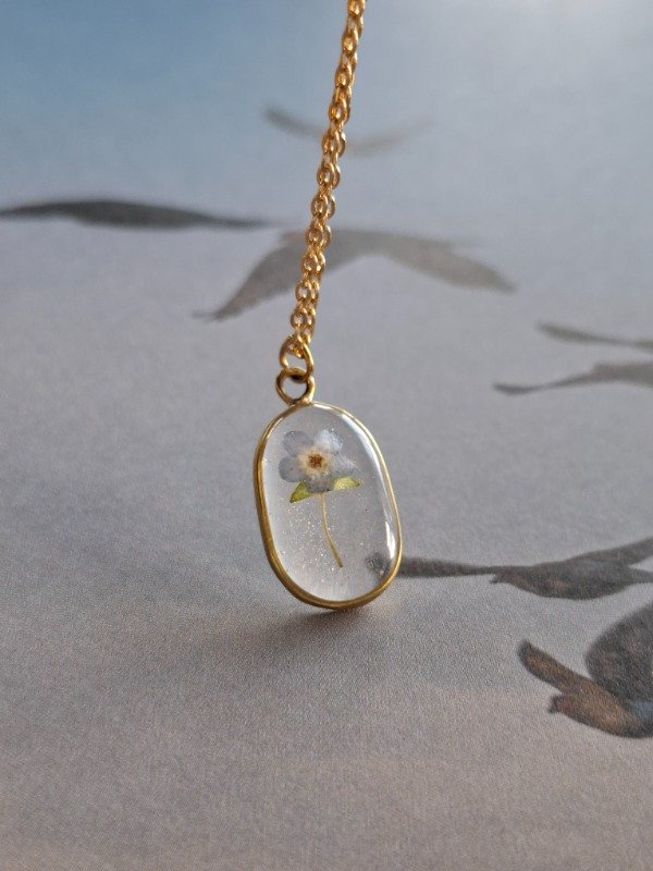 Este dije con un ramo de No me Olvides es una auténtica joya realizada en latón, e incluye su cadena de acero quirúrgico dorado y una bolsita para que te acompañe a donde vayas, aunque no lo lleves puesto :)