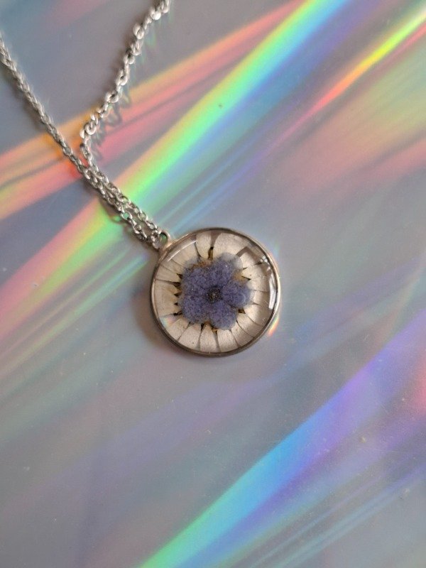 Este dije con una No me Olvides grande superpuesta con una Margarita blanca es una auténtica joya realizada en alpaca, e incluye su cadena de acero quirúrgico y una bolsita para que te acompañe a donde vayas, aunque no lo lleves puesto :)