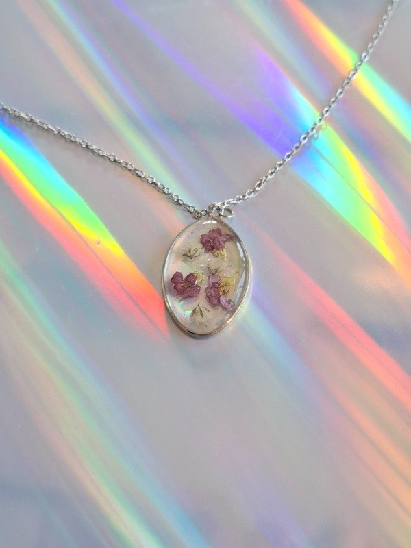 Este dije con Alisos violetas y Gypsophilas es una auténtica joya realizada en alpaca, e incluye su cadena de acero quirúrgico y una bolsita para que te acompañe a donde vayas, aunque no lo lleves puesto :)
